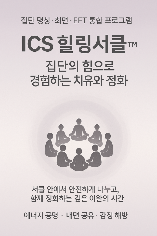 ICS 힐링서클™은 집단이 가진 에너지의 상승 효과를 통해, 혼자서는 도달하기 어려운 깊은 이완, 정화, 감정의 해방을 가능하게 하는 집단 명상 · 최면 · EFT 통합 프로그램입니다.